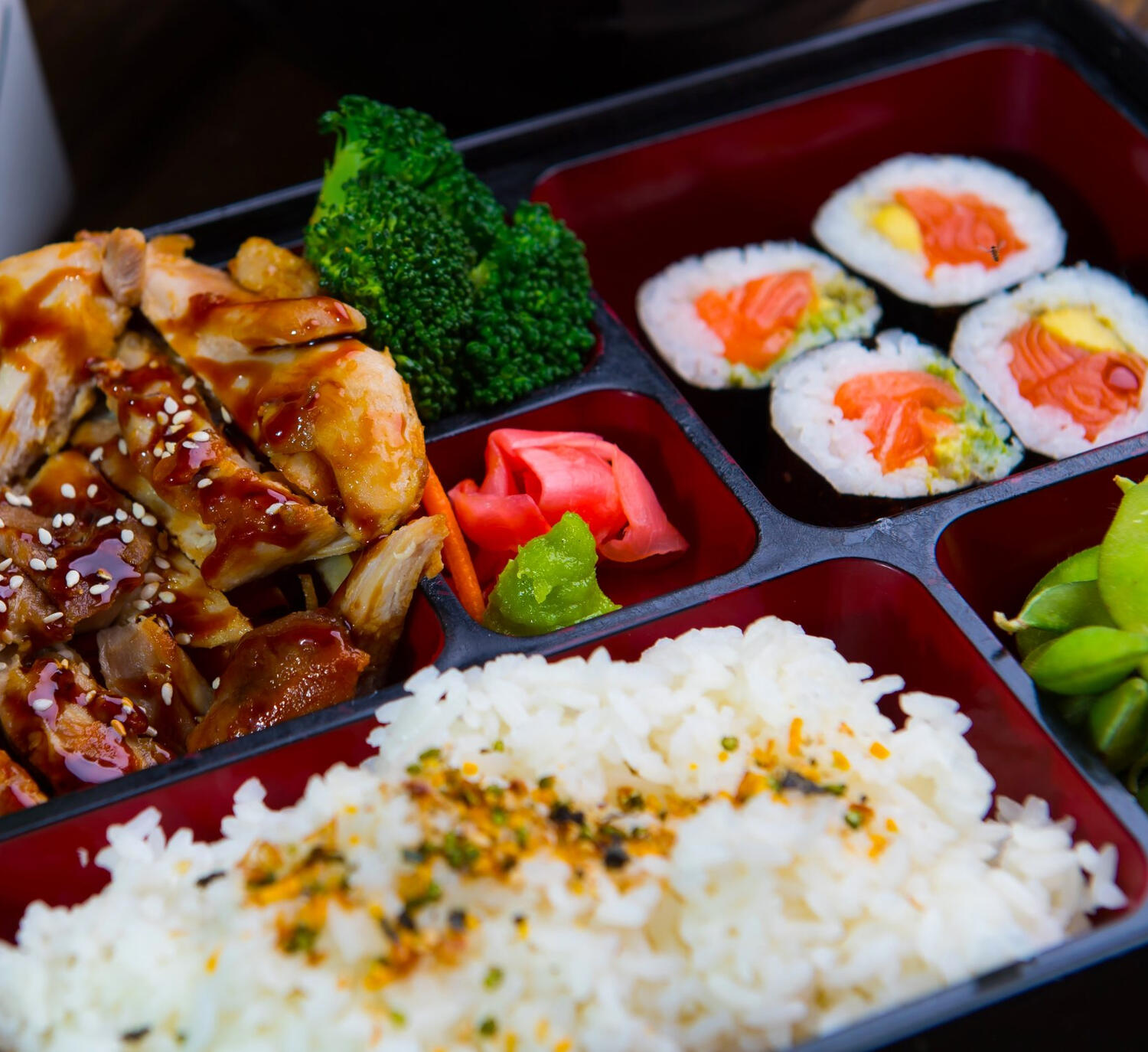 This bento features a pan-seared teriyaki-glazed chicken, edamame, furikake rice, salmon rolls, broccoli salad, and pickled red ginger.