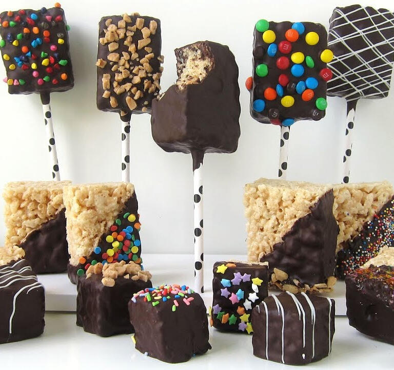 It's an addicting sweet: puffed rice toasted and bound together by marshmallows dipped in chocolate and paired with a topping. These tasty morsels are conveniently skewered with a stick, so your fingers won't get sticky!Types: Plain, Plain Chocolate, White Chocolate, Chocolate Candy Pieces, S'mores, Peanut Butter Pieces, Sprinkles, Almonds, Pistachios, Peanuts