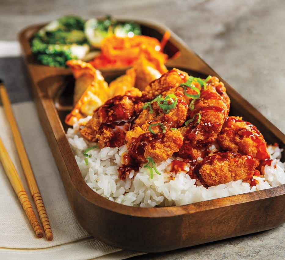 This classic bento features chicken karaage drizzled with a mildly spicy honey garlic ginger sauce, accompanied by pork gyoza, pickled carrots, and boiled baby bok choy.