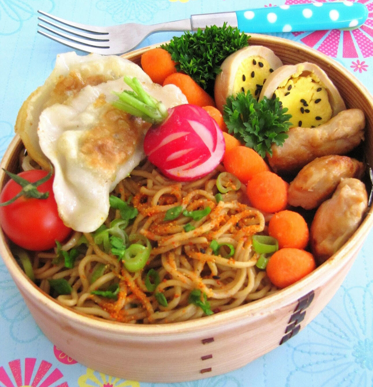 This bento box contains pan-fried noodles, pan-fried gyoza, steamed baby carrots, garlic chicken, soy sauce egg, radish, and cherry tomatoes.