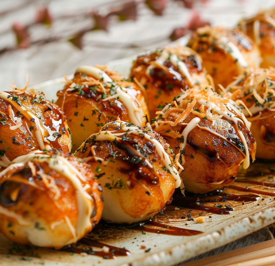 A classic street food item of pancake batter filled with minced octopus, tempura scraps, pickled ginger, and green onion. However, why not try an alternative filling to really get your taste buds moving'?Fillings: Cheddar Cheese, Wagyu Beef, Portabella Mushroom, Kielbasa Sausage, Thick-Cut Bacon