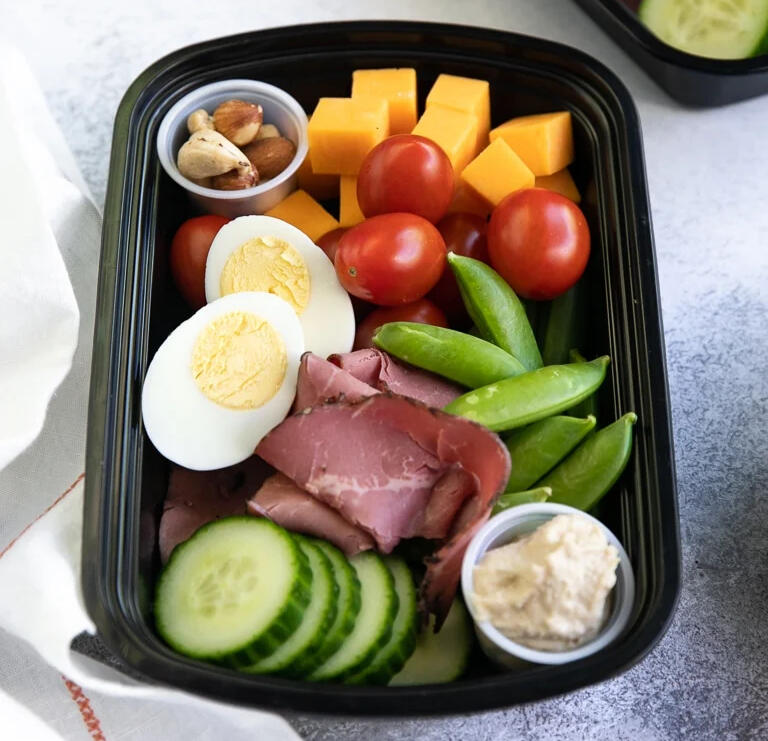 A vibrant, ready-to-go box filled with juicy deli turkey, hard-boiled eggs, sharp cheddar bites, crisp veggies, creamy hummus, and a handful of nuts for crunch. Every bite offers clean, satisfying flavor—fresh, savory, and perfectly balanced—while delivering a powerhouse mix of protein, healthy fats, and fiber to keep you energized through the busiest afternoons. Light, wholesome, and deliciously snackable.